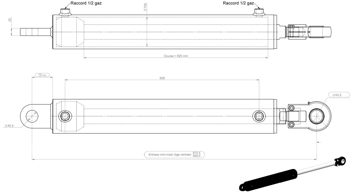 Vérin 50x100 tige réglable course 625